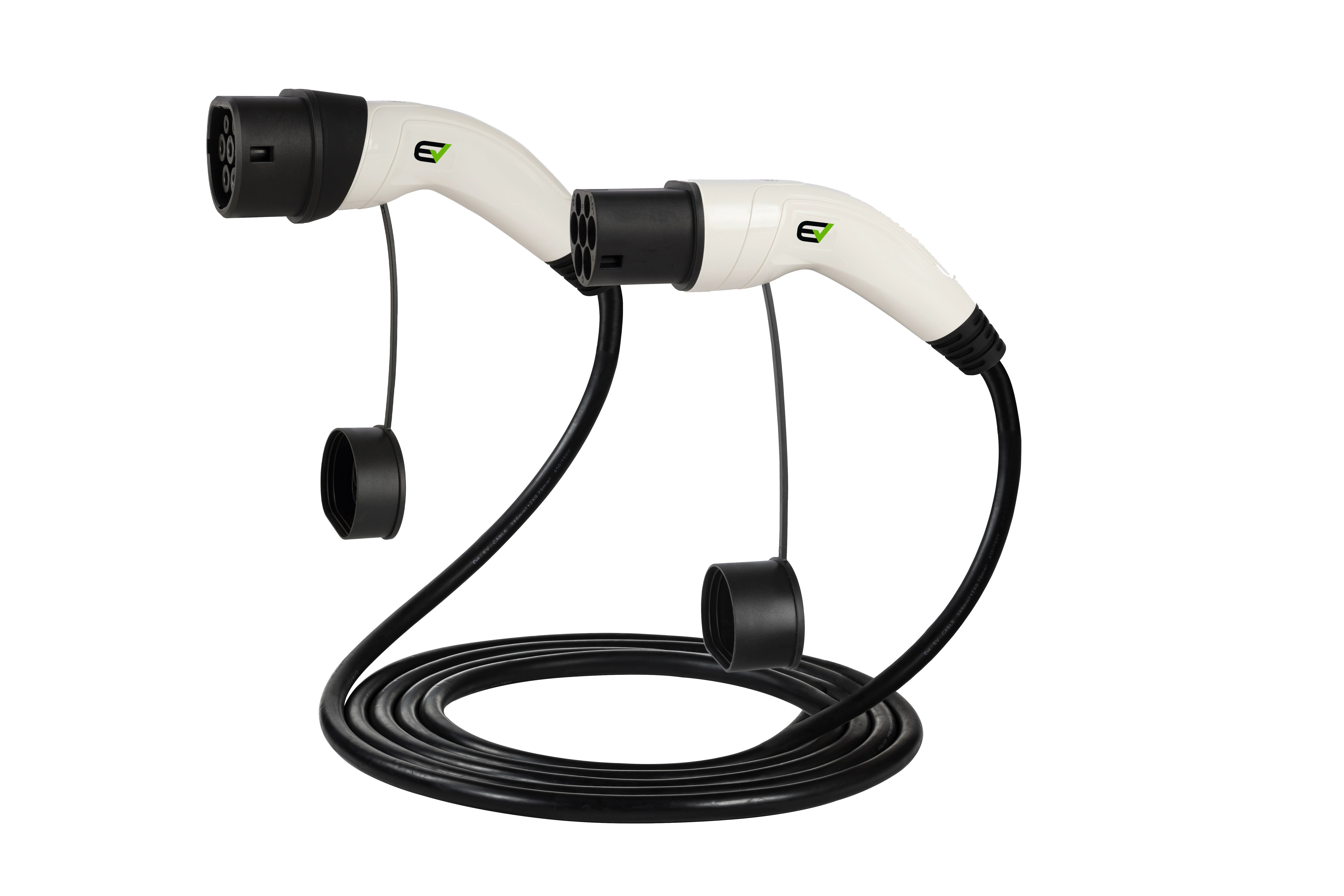 Cable de carga trifásico de 5 m con conectores Tipo 2 - Tipo 2 (macho-hembra). Conectores de alta calidad para potencia de hasta 22 kW / 400V AC / 32 A.
